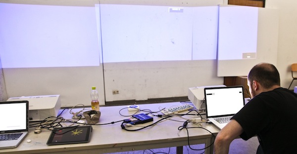 Depending on the WiFi signal strength and the resolution size we had a good performance with 1024×768 – but the laptop was struggling with performance as soon as more video layers or effects were added. The frame rate dropped at 3 layers to 14 fps and we stopped the experiment there.
