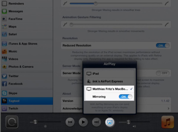 Now fire up your iPad and launch the Tagtool app – the laptop is already getting the desktop screen transmitted. Create a new composition according to the size of the syphon stream – 1024×768. In the very right area select the “sources” tab and left-click the syphon source. Render settings and transform settings are correct – so we simply drag&drop this item into the video layer.