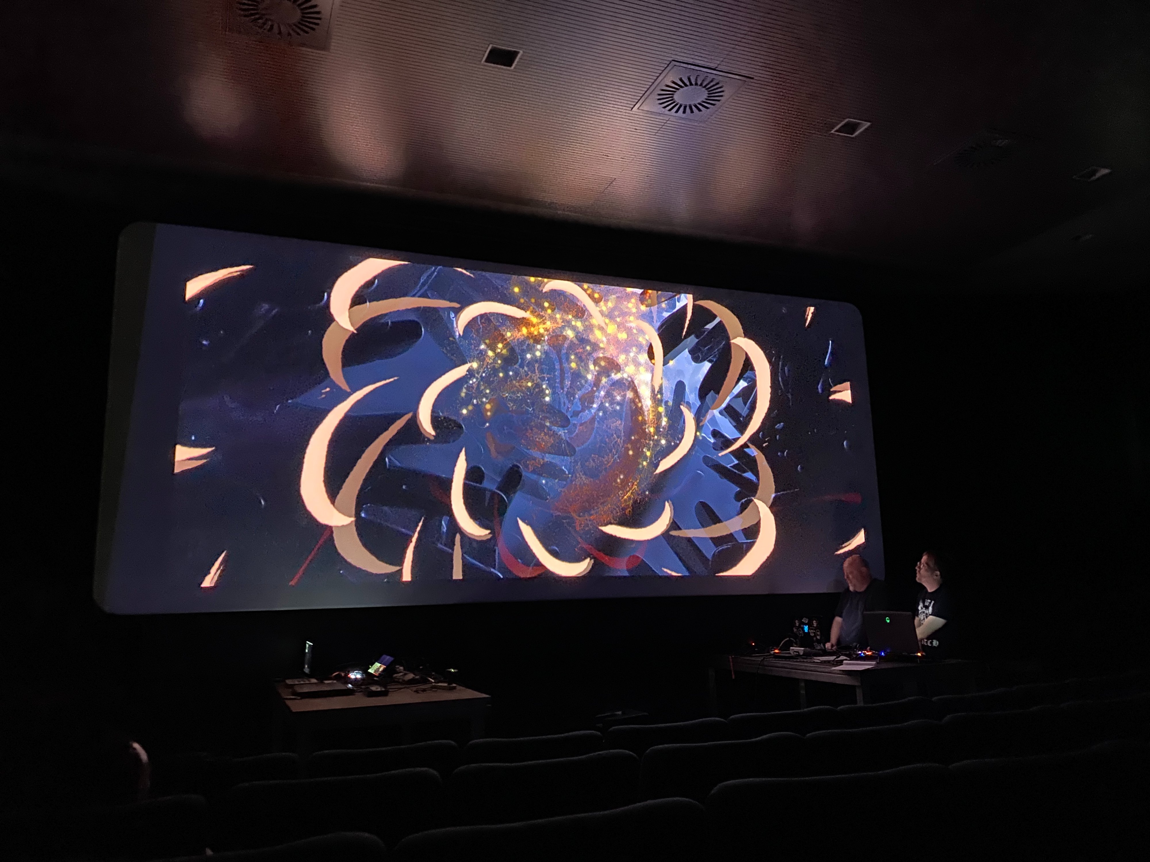 LPM held its annual video mapping contest in which contestants had to map and perform their visuals onto the cinema. What we noticed was the variety of software packages used. Many performers were using Resolume Arena, but we also saw custom Touch Designer patches, Processing code, VUO applications and even a live 3D-drawing using VR.