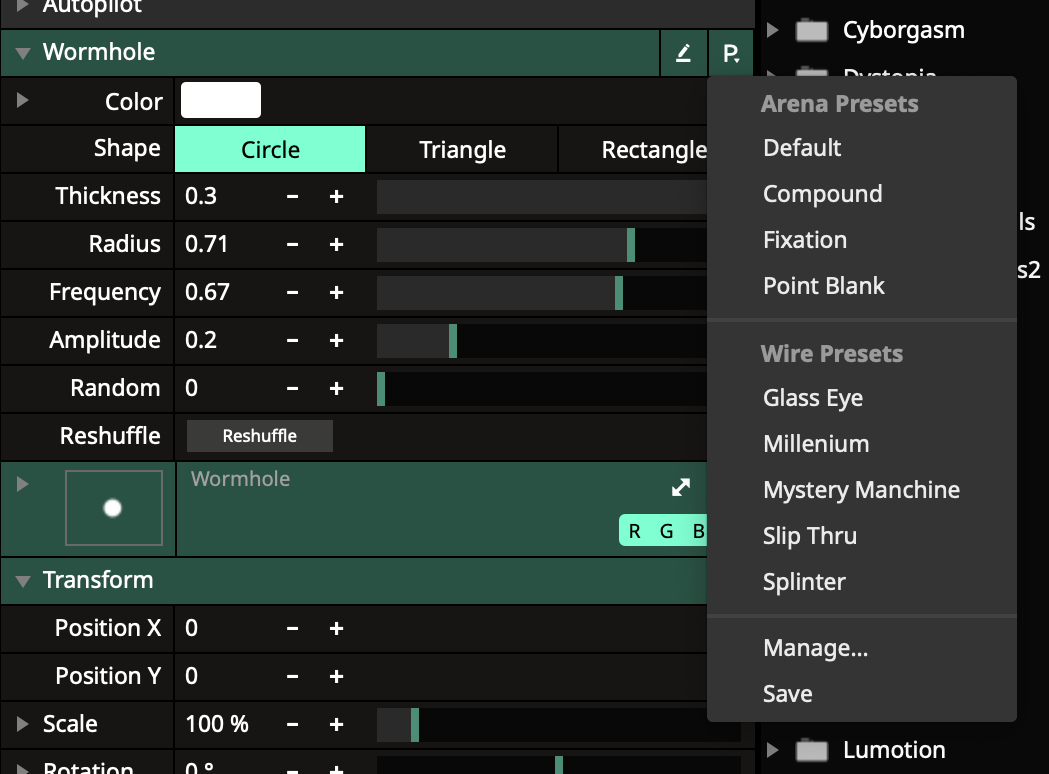 You can now create and manage presets on the Wire Dashboard panel. These presets will show up in Avenue & Arena for quick access during live shows. You can also create Arena presets for Wire patches, compile the Wire patch and they are then bundled with the patch for easy distribution.