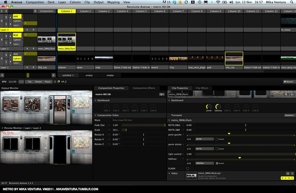The need to use Resolume became obvious really fast, as 80% of the content was created with Quartz Composer, like the 3D metro train or the backdrops charting on different layers. The Resolume interface, with its layer levels and its possibility to directly control Quartz Composer elements offered us the flexibility we needed. More over, we had to use two 10.000 lumens projectors connected to a Mac via a Matrox Triplehead2Go. Using IRmapio, we were able to create a soft edge in no time.