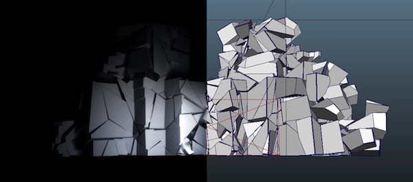 It started with some initial concept set sketches which were then modeled in Autodesk Maya, after some refinement and tweaking we decided on the final set. Through a process of trial and error, our mock up set was then cut from polystyrene according to our measurements. We used a combination of Maya and After Effects to create the visuals.