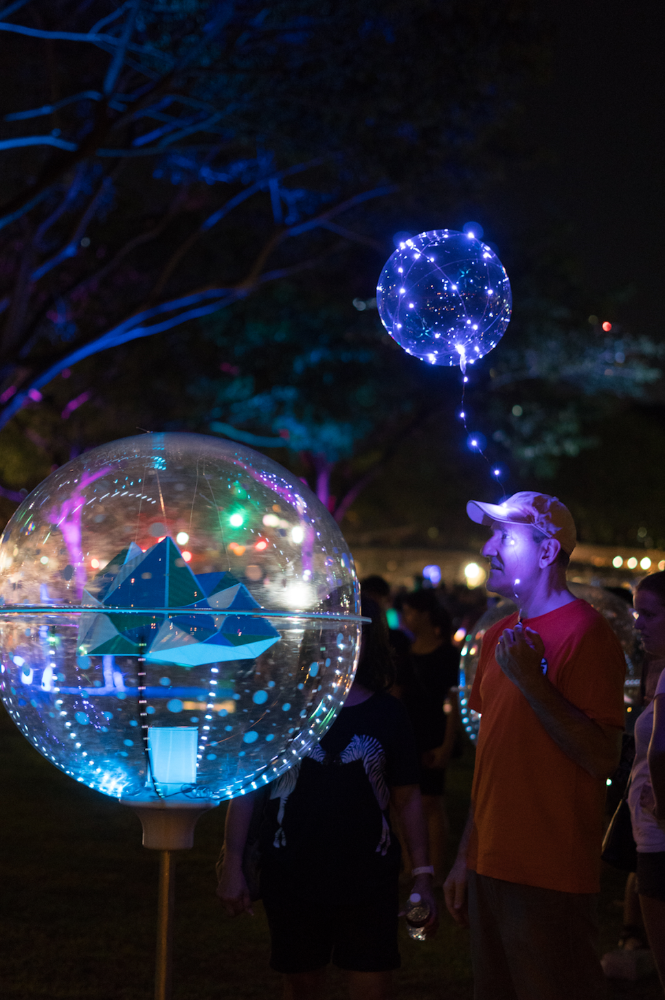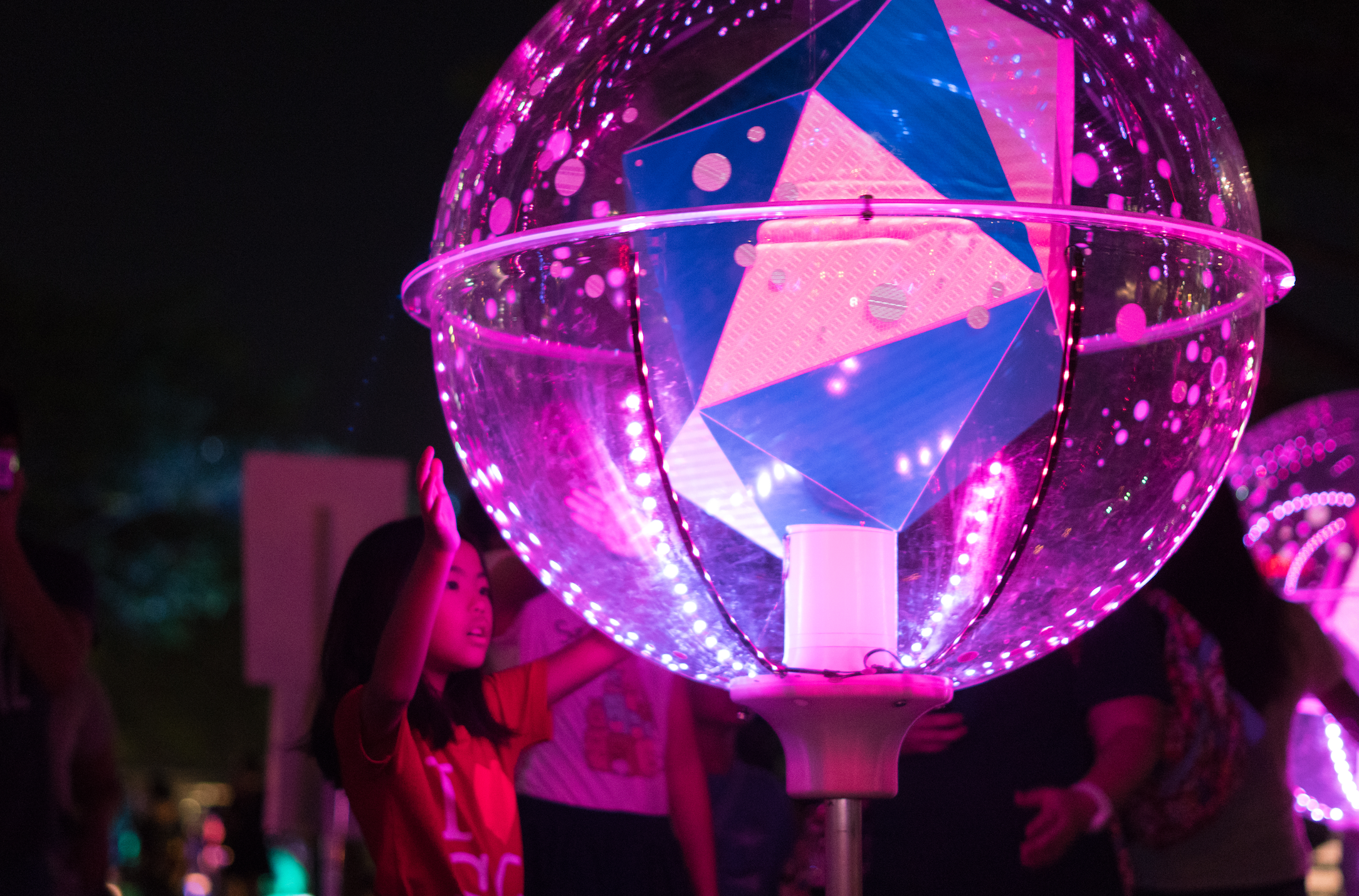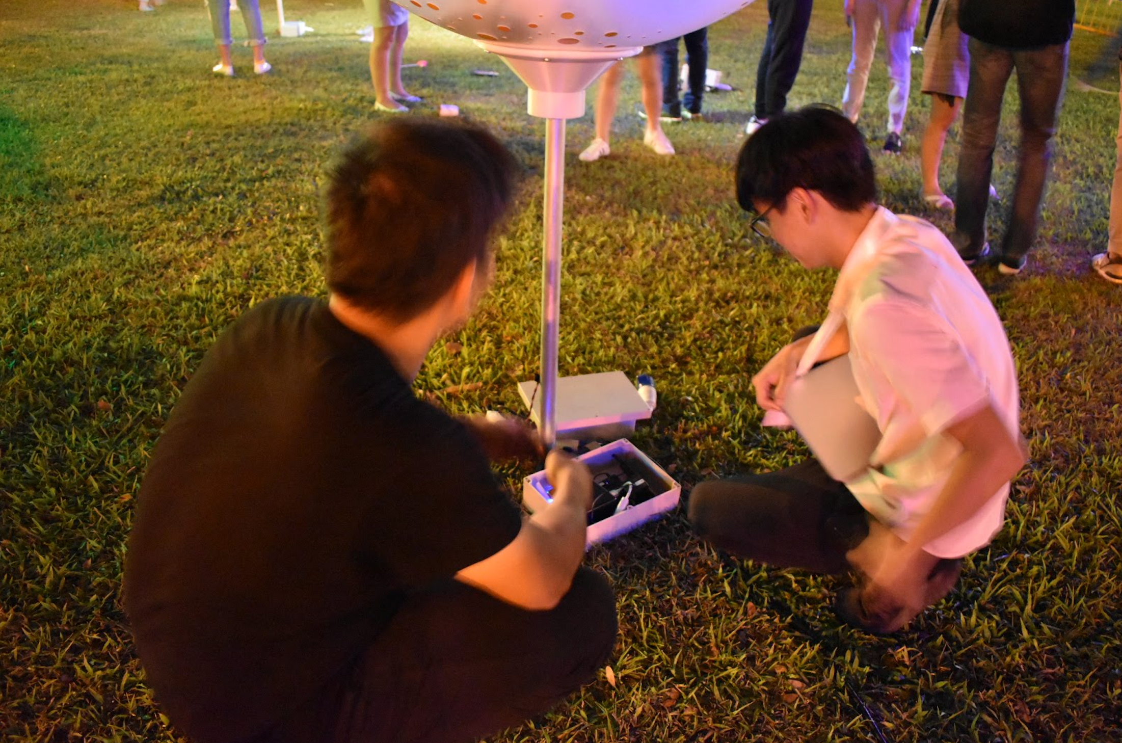 Linking everything wirelessly gave us a lot of convenience, but of course we had to deal with the downside of using WiFi. We noticed that when the festival got crowded, the micro-controllers tend to disconnect from the network, and would freeze on the last received ArtNet frame. We then had to power cycle these frozen micro-controllers from time to time. It could have been interference from mobile phones with their WiFi and Bluetooth turned on, or because our low powered WiFi router was not equipped to deal with 10 simultaneous connections (1 server, 9 spheres).