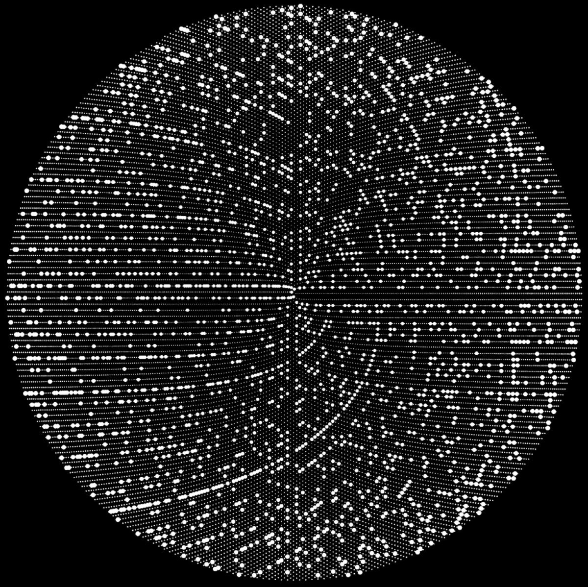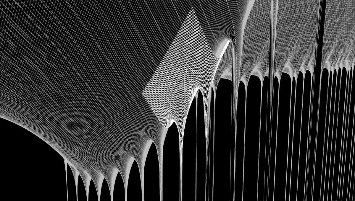 And, the other main chapter of relevance here is the first chapter, on the distribution of the prime numbers. Because I was working with a mathematician rather than a typical visual artist here, we chose to minimize and simplify the visual form to its basics, black and white wireframe representations of the data. The Chromos chapter also used real data.
