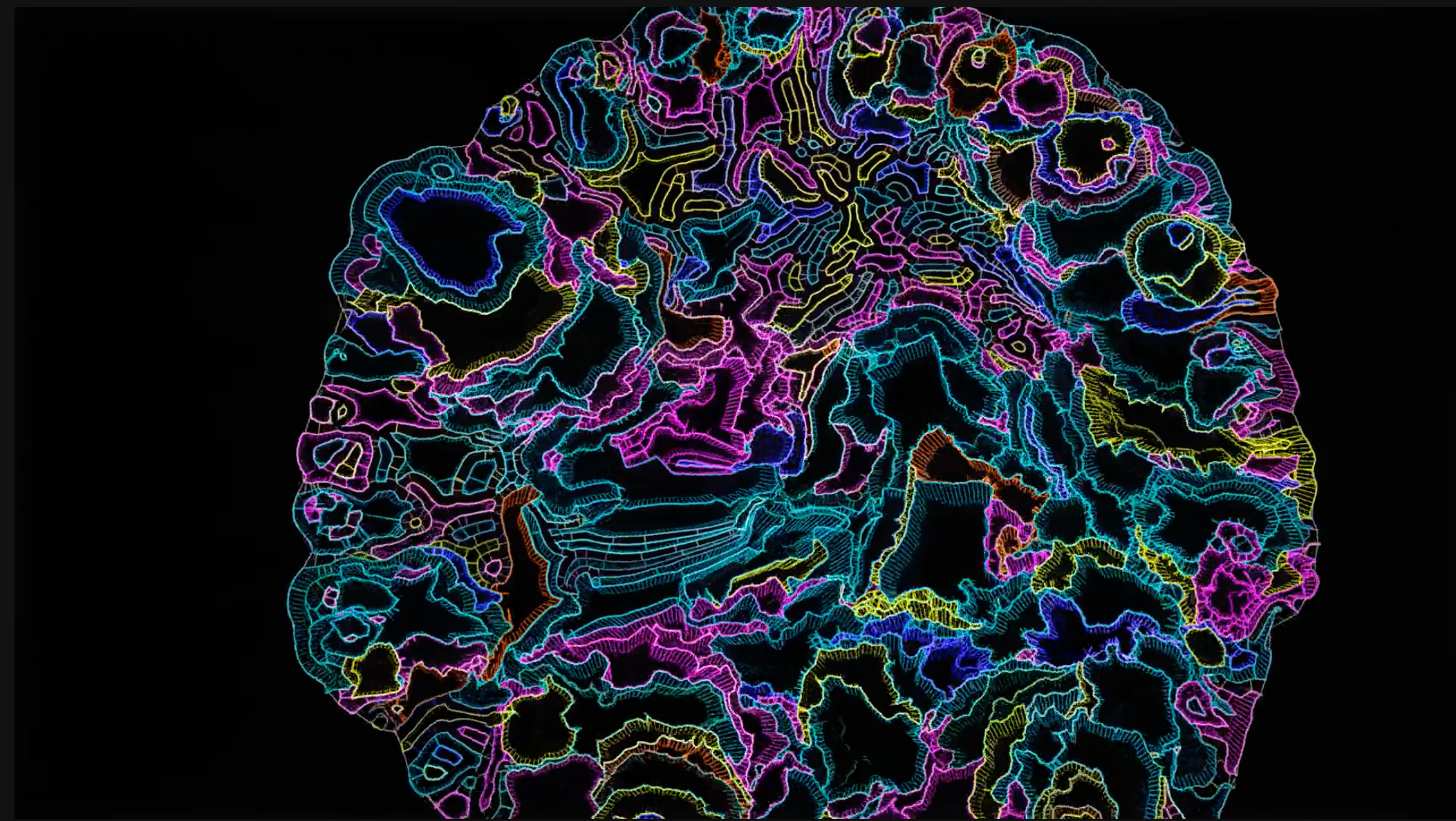 Andy Lomas’ cell growth simulations already existed before my project, he is a mathematician and artist who has been working with generative art techniques for many years, and I was just lucky to have his work put in front of me by a mutual friend, upon which I started some very interesting conversations and collaborations which are still ongoing now. It just happened that Andy’s work fitted perfectly with what I was aiming for with the project.