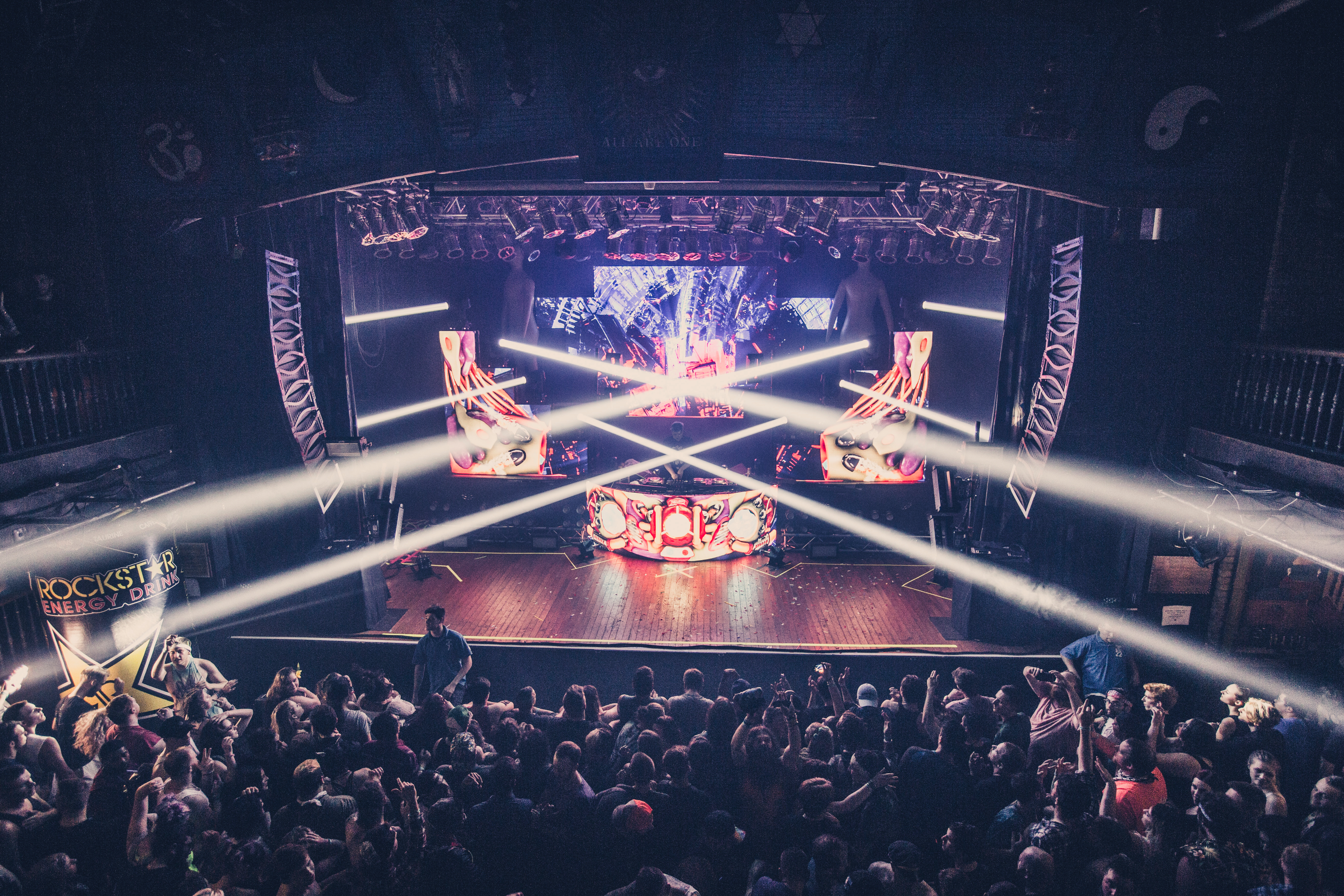 On stage, Jeff has your standard CDJ/DJM setup with a control panel for cryo/automation and monitors. The monitors show the video for each track, master output and a dedicated camera feed. Jeff will frequently jump between cue points when setting up a track to mix in so we couldn’t use traditional timecode for our video system. Because he frequently needs to see the video as he scrubs through audio, which makes SMPTE impractical for our video system.”