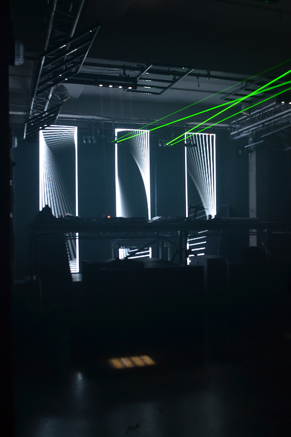 In the video we’re using 70x RGB pixel battens, a 12mm LED screen, 24x green point lasers and 4x RGB sweeper beam moving head lights. Everything runs from inside the new Resolume Arena 5 software. We’re running the LED screen straight on DVI, while all the other fixtures are controlled using a Showjockey 16way Art-Net to DMX box on 16 lumiverses.