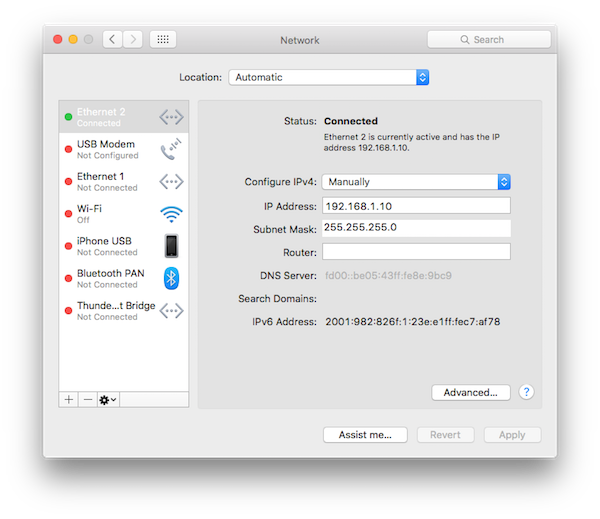 An Art-Net device is essentially a network device, so it needs an IP address in order to let the sender computer know where to send its packages. Unlike a computer, Art-Net devices generally are programmed to have a fixed IP address. We were informed that all Showjockey devices default to IP 192.168.1.200 and subnet mask 255.255.255.0. Since our office network expects all IPs to be in the 192.168.178.x range, we had to jump through some hoops to get the devices to work.