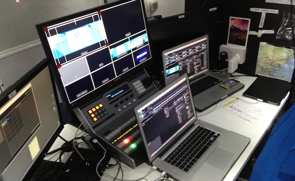 They used 2 x macbook pros with a Blackmagic ATEM mixer feeding into 2 custom LED screens that were built into a truck on either side.