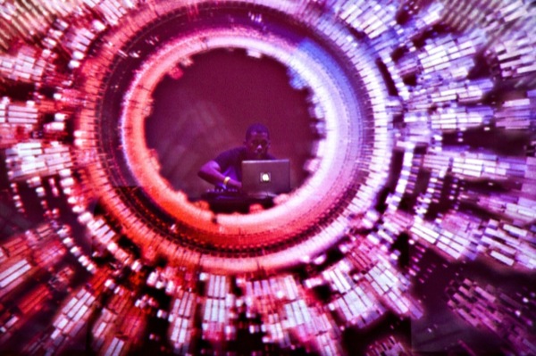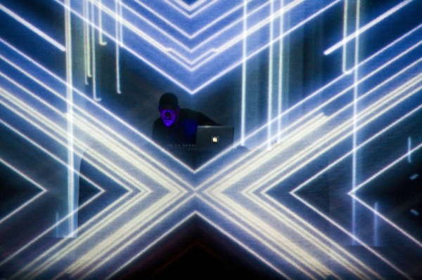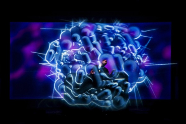 Within minutes we come to the conclusion that this audio/visual setup has been done very nicely. With beamers everywhere, the projection is seamless and with Flying Lotus standing in between the two large screens, he appears and disappears in the overlapping visuals. We're intrigued, so we shut up and enjoy the show.