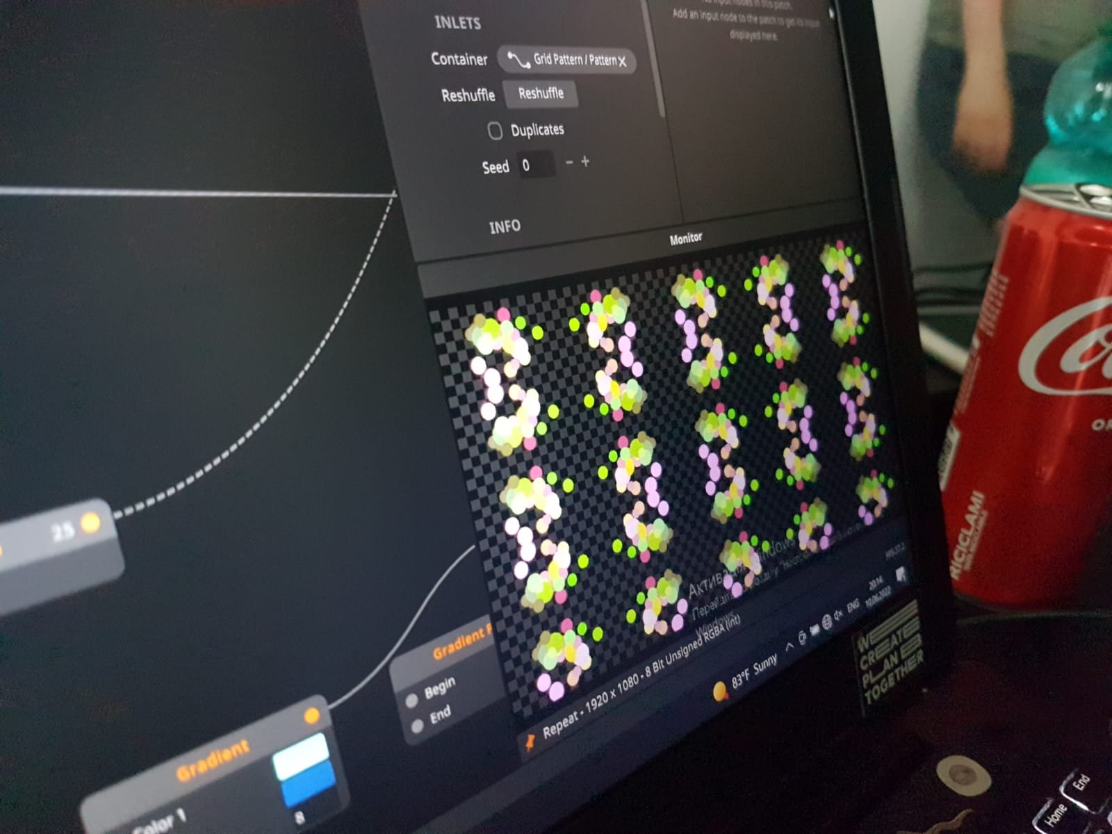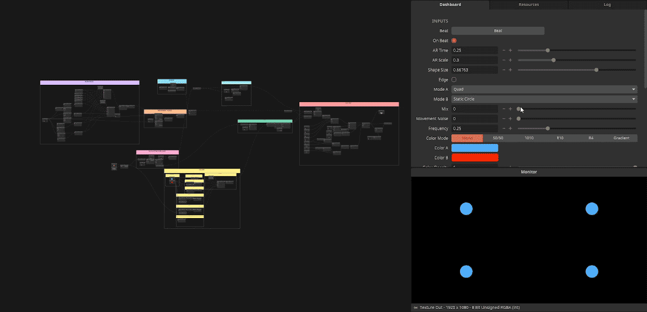 The patch has 10 circles, using a Circulate node and an Attack Release node I am able to blow up the sizes of the circles on each beat. I decided against using the Transport Beat node to get beat triggers, instead I created a manual Trigger In node, which gets triggered in Arena using a BPM-synced envelope.The reason for this is that during the performance I used the patch twice, layered on top of each other. One version of the patch responded to the beats, the other to the bars.