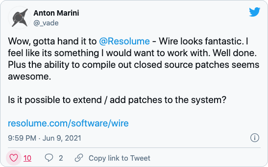 "Wow, gotta hand it to @Resolume - Wire looks fantastic. I feel like it's something I would want to work with. Well done. Plus the ability to compile out closed source patches seems awesome."