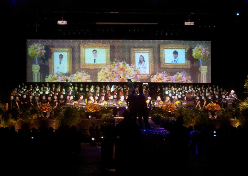 It was an university graduation cerimony. Behind 150 sitting graduates, ther was a 16m x 3.5m panel, a printed banner in other ocasions. Not this time. Two projectors were used to map a decorative animated background.