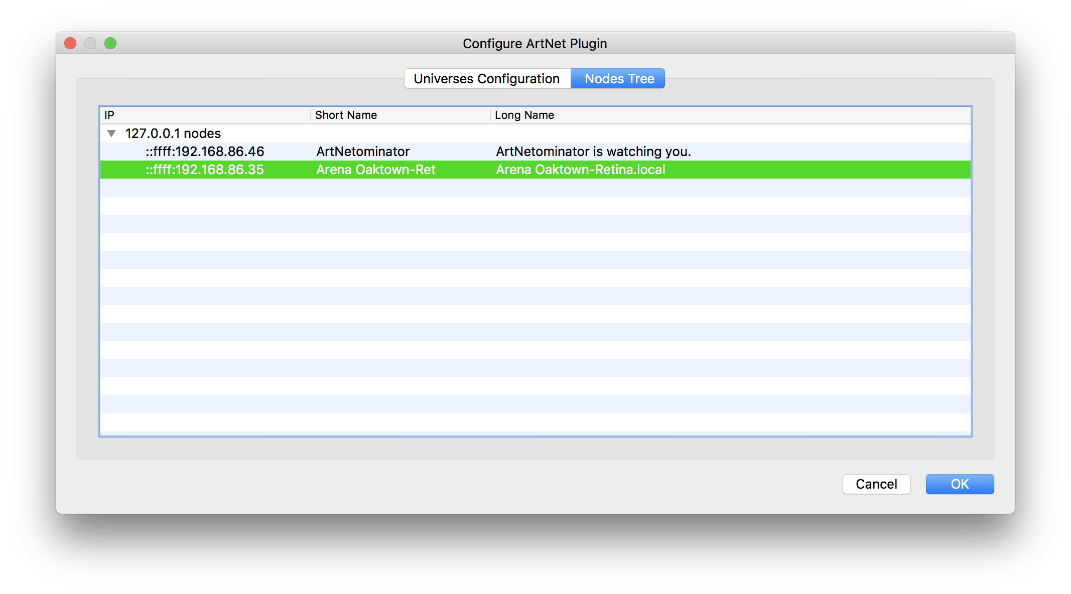 QLC: The ArtNet Node Resolume created for all sorts of IPs are shown, yet connecting doesn't work, it won't use the input. Artnetominator shows all as fine, i.e. for 127.0.0.1, and QLC sees the node - but won't listen. It only listens when using 127.255.255.255 in Resolume! It needs the wildcards in order to loop-back inside my machine.
