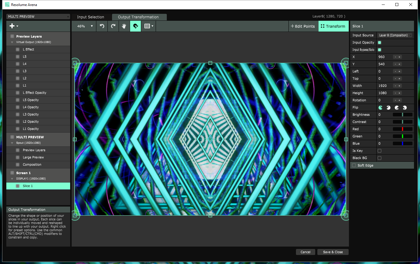 Nevertheless, a Virtual Device can be used as the source for one or more slices on another Screen, which could make for some interesting nested compositions. And this brought me to the idea of sending my Advanced Output mapping/arrangement back into the Composition so I can see it in the main UI, specifically in the Output Monitor window. The way that I use Resolume, the "Composition" is really not that useful a thing to be forced to have in that window, since it doesn't usually represent any projection mapping that I'm doing.
