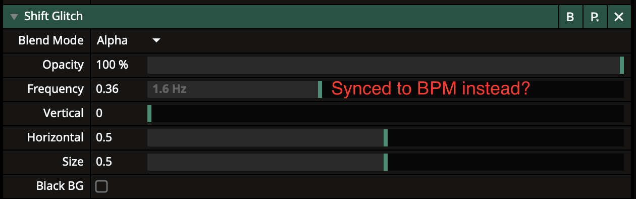 I'd really like to be able to sync the glitches in the Shift Glitch effect to the BPM tempo. Right now you can choose variable speeds, but they don't sync up to the beats in the music. Shift glitch can create a nice, chaotic look sometimes, but I often find myself thinking that they glitches would look so much better synced.