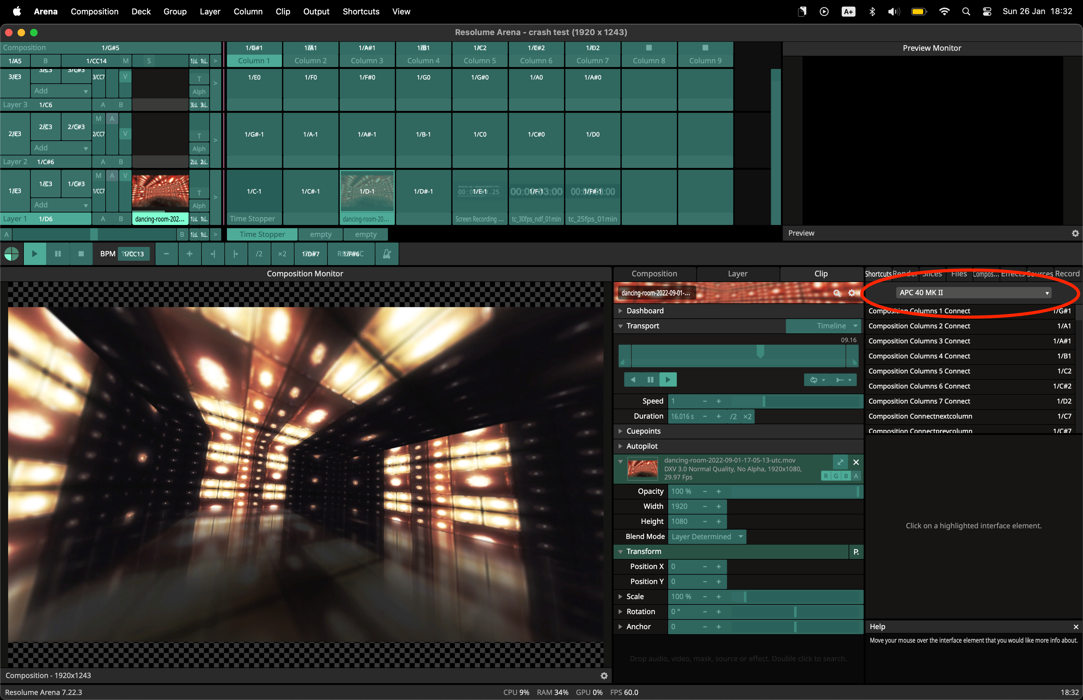 I use different setups with Resolume Arena 7, one of which involves sending MIDI signal from Ableton Live through a MIDI "agregate". I also use an Akai APC 40, Akai Mini or Korg Nano. Different setups for different projects...