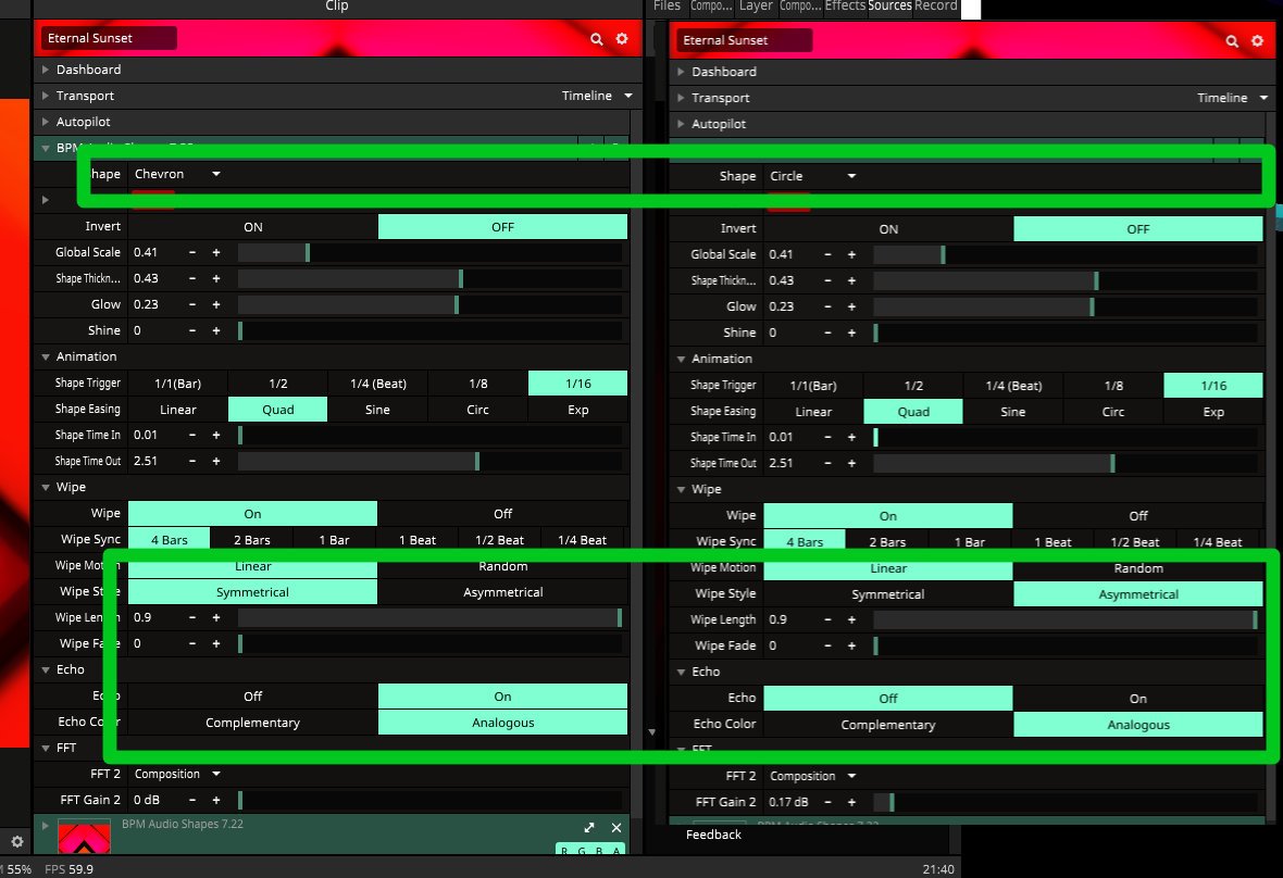 Here's the changes applied to one of the clips in Resolume. The second one shows the setting of the original preset