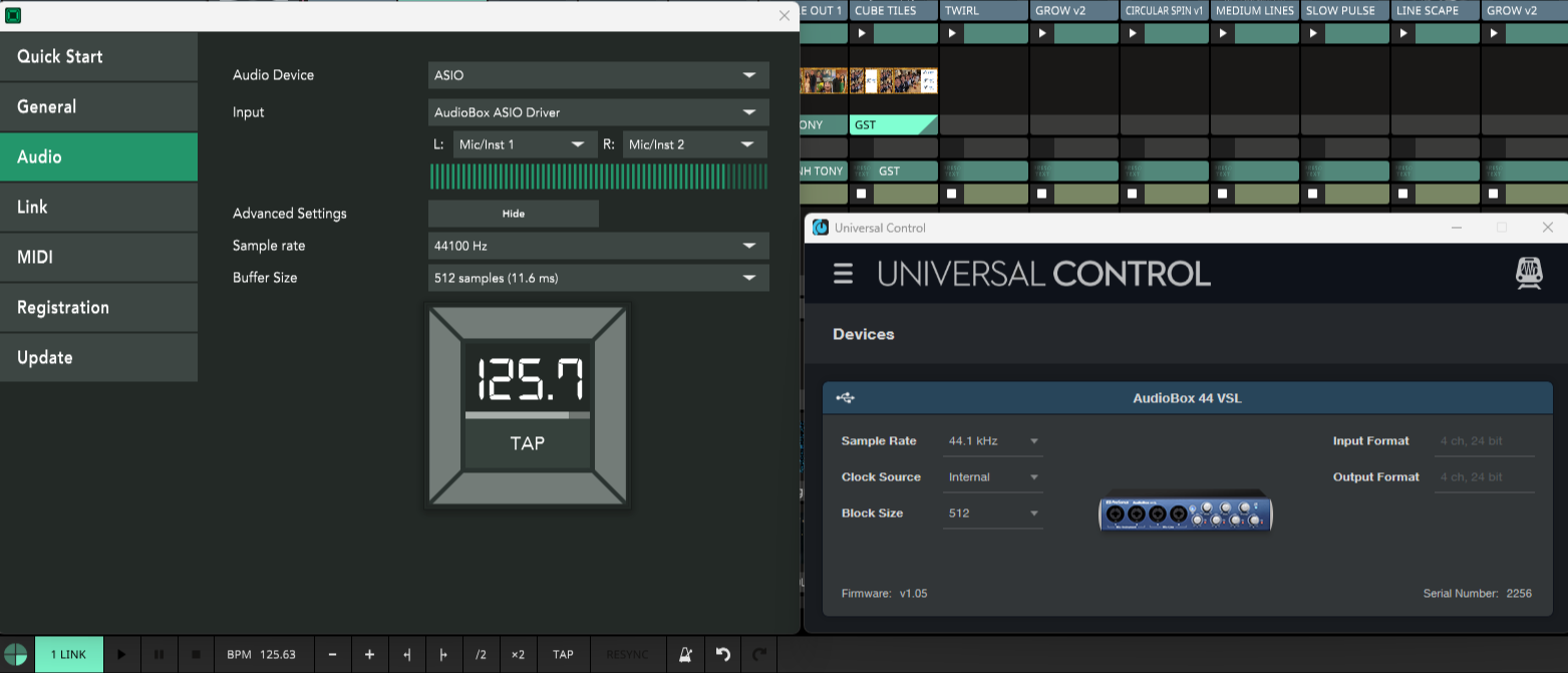 I'm having issues getting Pulse to work. My setup is Resolume 7.22.9 + AudioBox 44 VSL + ShowKontrol. Looks like all my settings are correct its just not flashing green and failing to syncing up. I've tried to adjust the volume levels on my audiobox device, different buffer sizes, different mic/inst and still nothing.