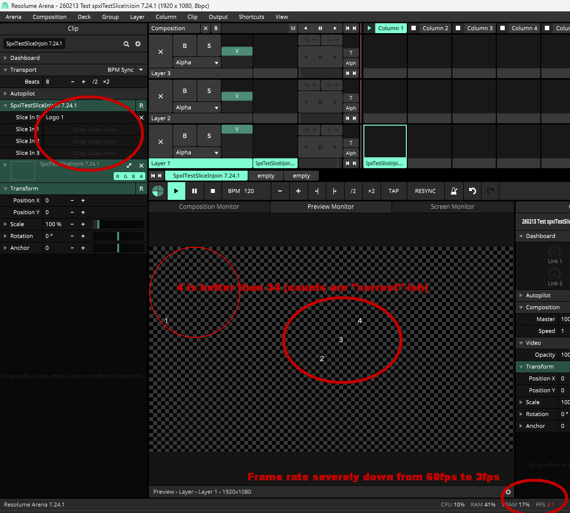 260213 Test spxlTestSliceInJoin 7.24.1 02 Resolume slice counts correct-ish, frame rate terrible.png