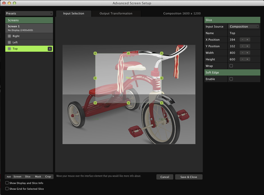 The Input Selection of the other two slices need to be 800x600 as well, and take their input from the bottom left and right of the Composition. In the Output Transformation they're 800x600, but placed in the middle and right of the Trips.
