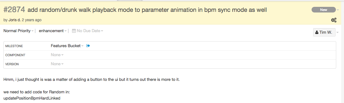 For instance, Tim is currently rewriting parameter animation, so that we can have more and betterder timeline options ( think step sequencer, keyframes :o ). This is also a logical point to try to get in the random playback.