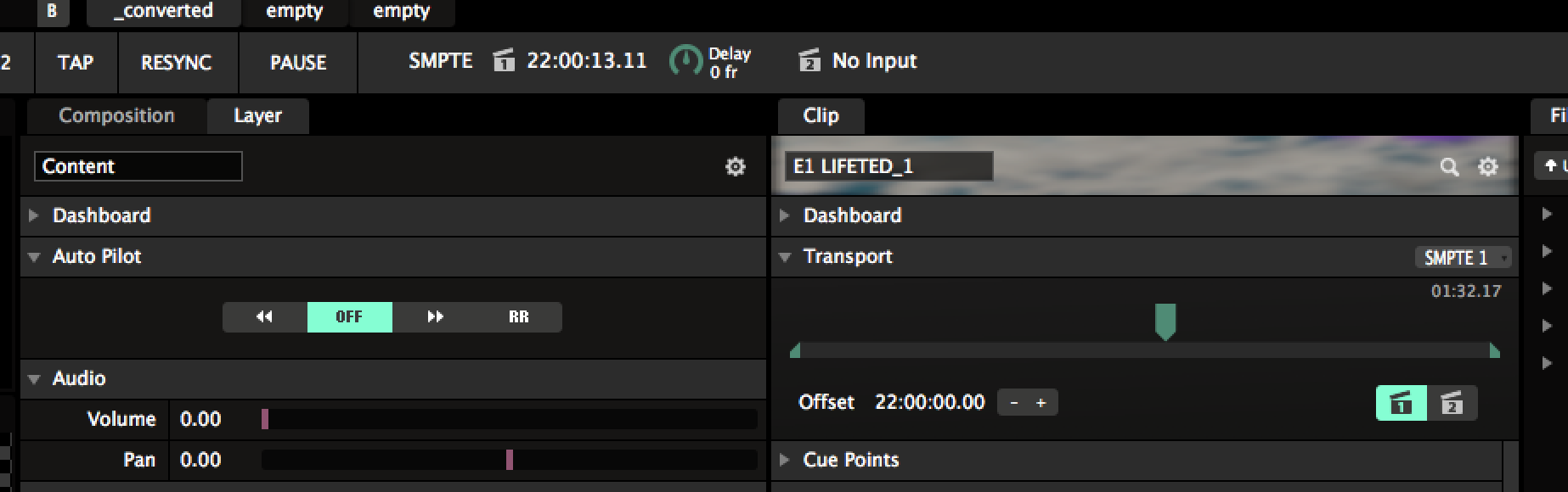 So I am trying to get SMPTE timecode working in Arena 5.1.2 and everything works fine, the current timecode read in is correct and there are no drop frames etc. But when I set the offset at say 04:00:00.00 for a clip and the timecode reaches that value the clip starts playing in the middle of the timeline.