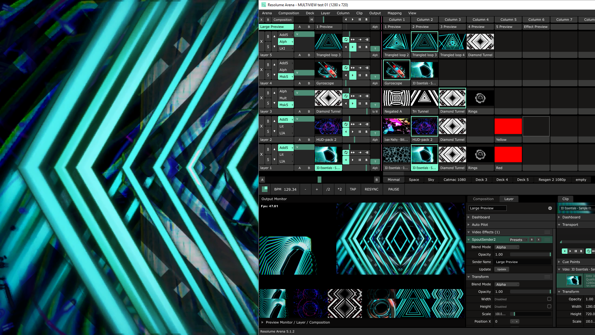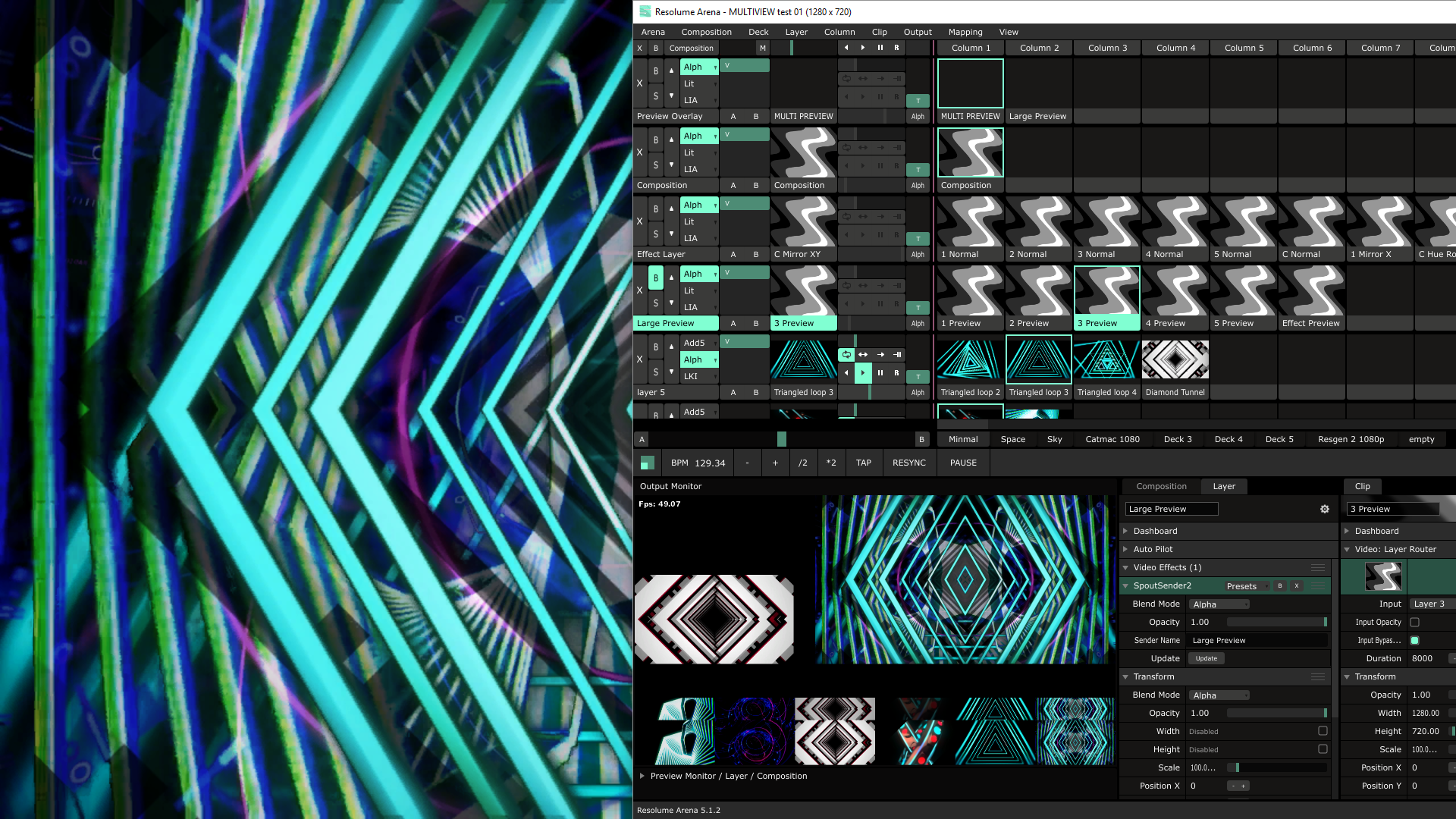 The output device for this screen is Spout (shows up in Spout source listings containing the screen name, "MULTI PREVIEW"). Above we see a basic "main output" screen, which, like the MULTI PREVIEW screen, has the input source set to the layer router pulling the composition prior to the multi preview overlay.