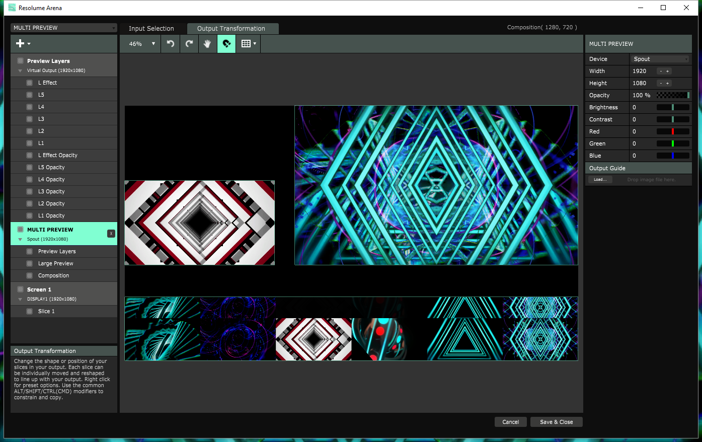 Above is detail showing that I have a layer dedicated to the "Larger Preview" slice. It consists of layer routers that pull the contents of the first 5 layers (with video content) as well as my "Effects" layer which, unusually, is actually higher up in the layer stack - since my screenshots are already this way and I haven't tested it in another order, that's the way it is for now. It should be able to work moved up two layers, between the "Composition" layer router layer and the "Preview Overlay" layer. Above is shown the Virtual Device where I arrange just the 6 "content" layers for previewing. The bottom row has slices that ignore the layer Bypass and Opacity settings. The top row has slices that do not ignore those settings. This way I can see what content is in the layer as well as how strongly it is being applied to the mix. Above is the Advanced Output arrangement for what I want to appear in my Output Monitor window in the main Arena UI. The Preview Layers slice is sourced from the Preview Layers Virtual Device (cool!) and the "Larger Preview" (top left) slice input is a separate layer in the composition with Layer Routers used to make a 6x1 switch.