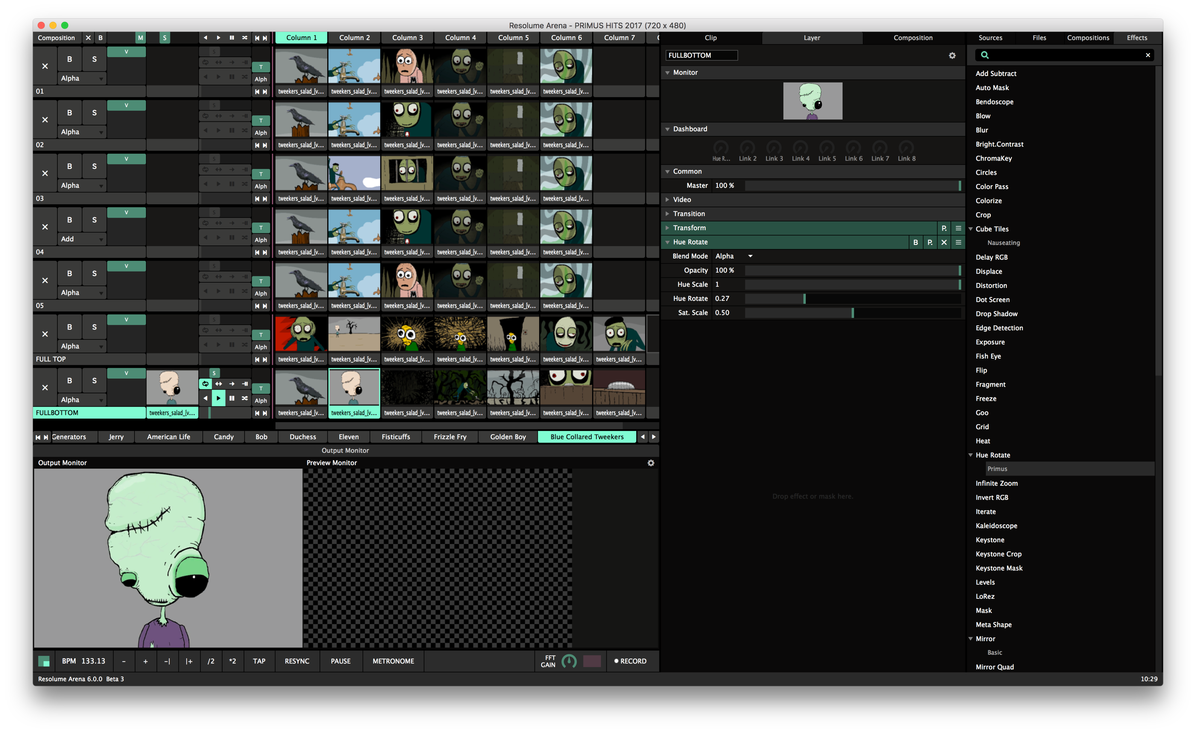 Hue Rotate added to the Layer FULLBOTTOM. Layer FULLBOTTOM is selected so the effect works fine. The hue rotate attribute in the effect is assigned to a mini shortcut.