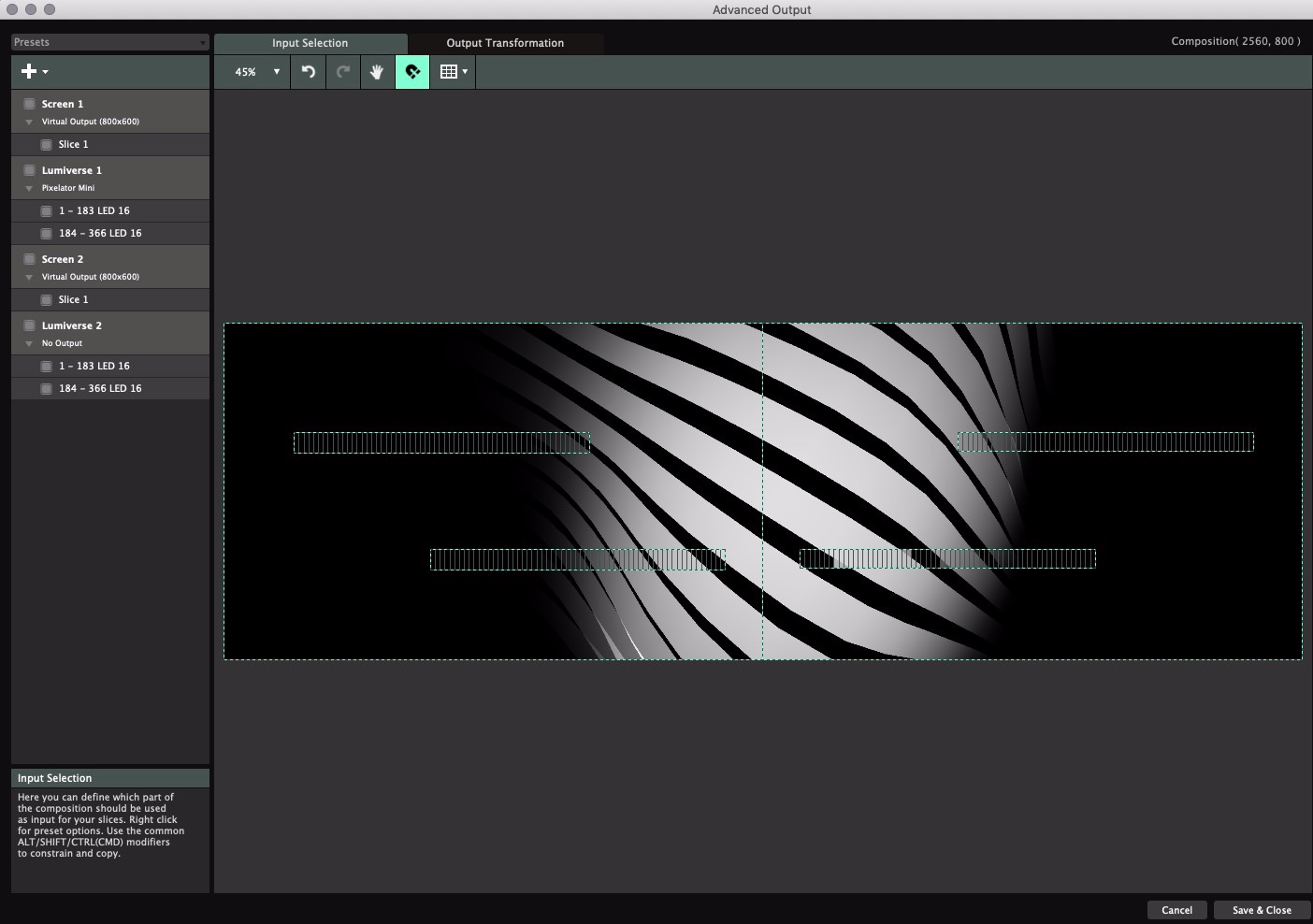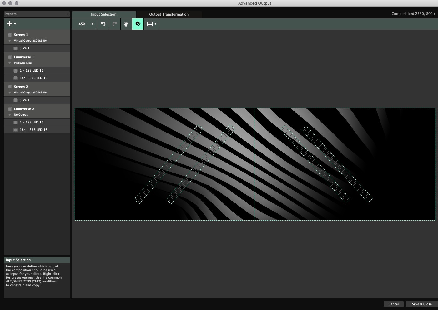 Well, the Input Selection position just defines which area of the composition is being used to sample pixels from. Changing those pixels in the composition would mean you sample different pixels and thereby output different pixels. For instance, your third look could also be created by keeping the sample orientation the same, but rotating the left half of the comp 45 degrees clockwise, and the right half 45 degrees counter clockwise.you can just have one setup for all the lumiverses and fixtures. So that if I want to mirror a video on to the Pixel tapes, they need to be in the same position for the video to be presented correctly