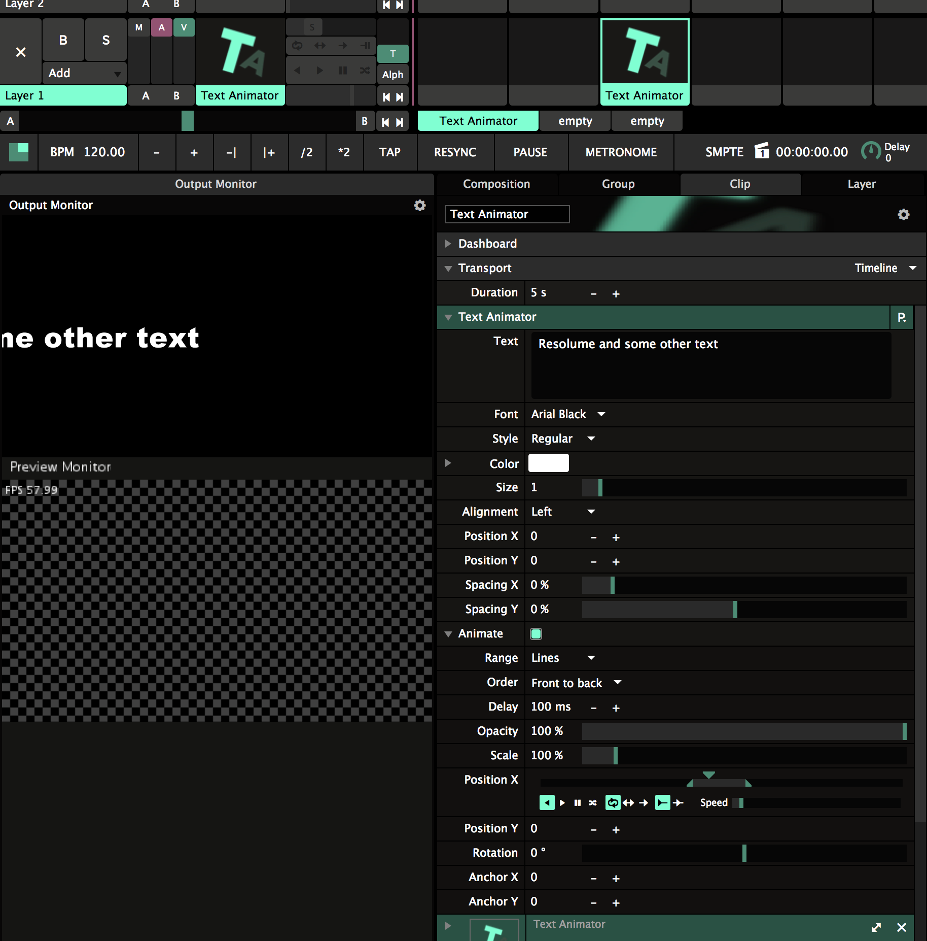 2: in resolume 5 your text can be placed underneath each other and then you first see the first one and then the second one can also see it in the 6