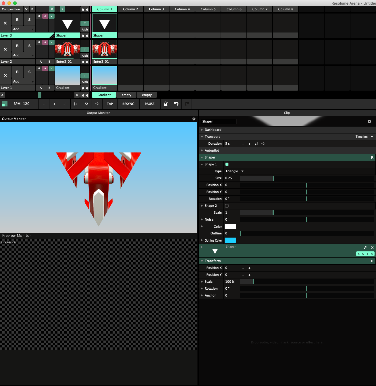 For the Triangle, Load the Shaper source in one of the clips in the Third Layer. Chose Triangle for Shape 1, set the Outline to 0.