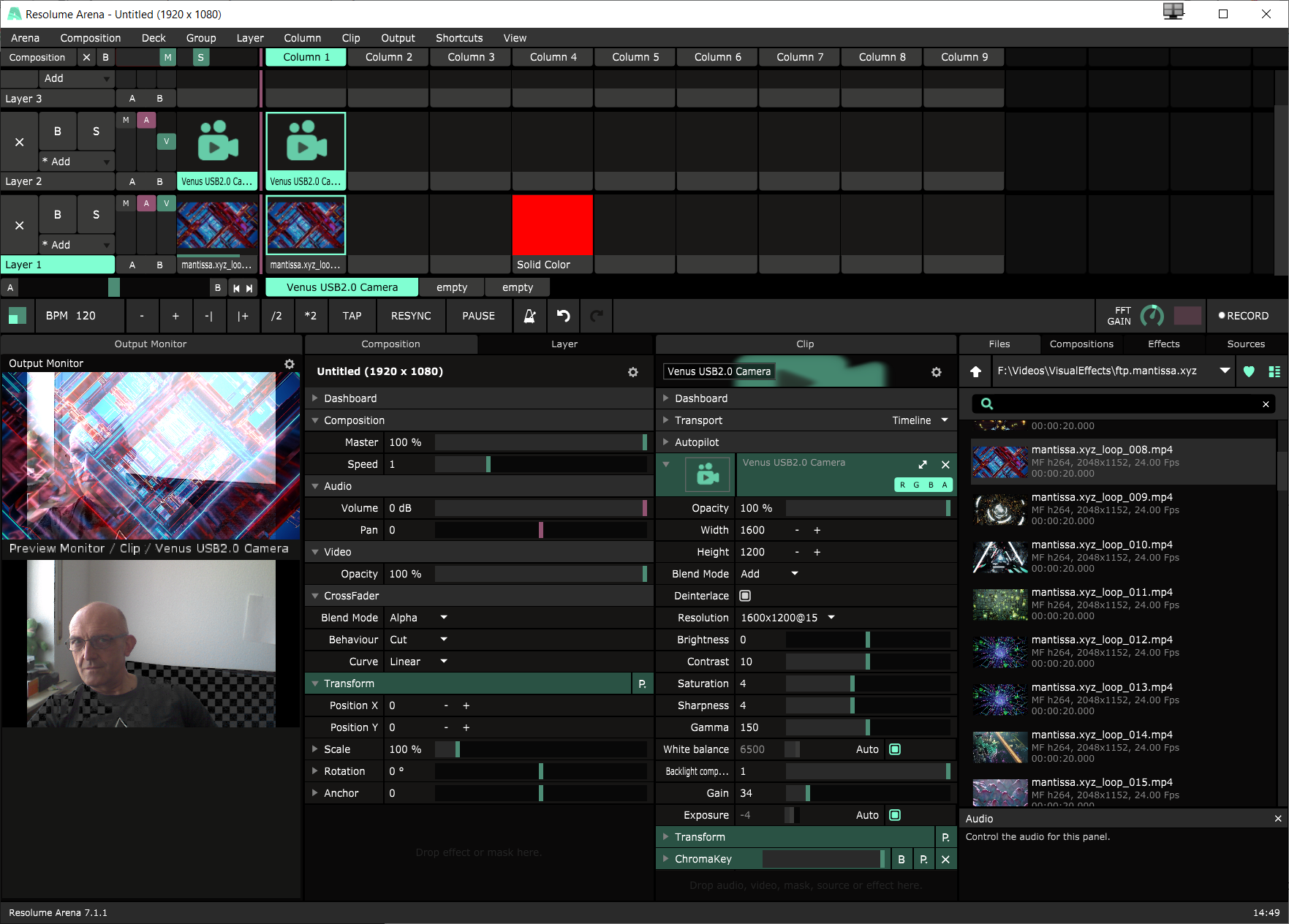 Layer 2: webcam/feed with green/blue screen + Add ChromaKey effect (select green/blue)