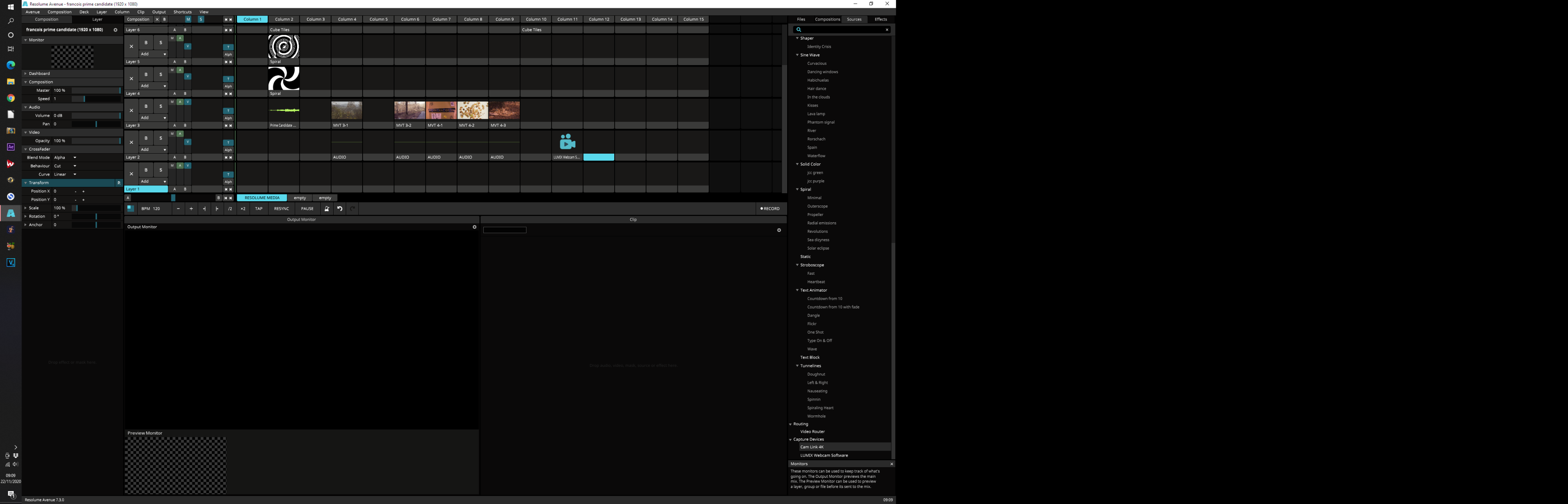 1. Resolume screen showing Cam Link 4K and Lumix Webcam Software listed as Sources. Now that I've loaded the Panasonic software, the Lumix software is always visible, whether or not I have a camera attached. (as a side comment, this is actually quite handy when I'm laying out columns/layers for a performance.