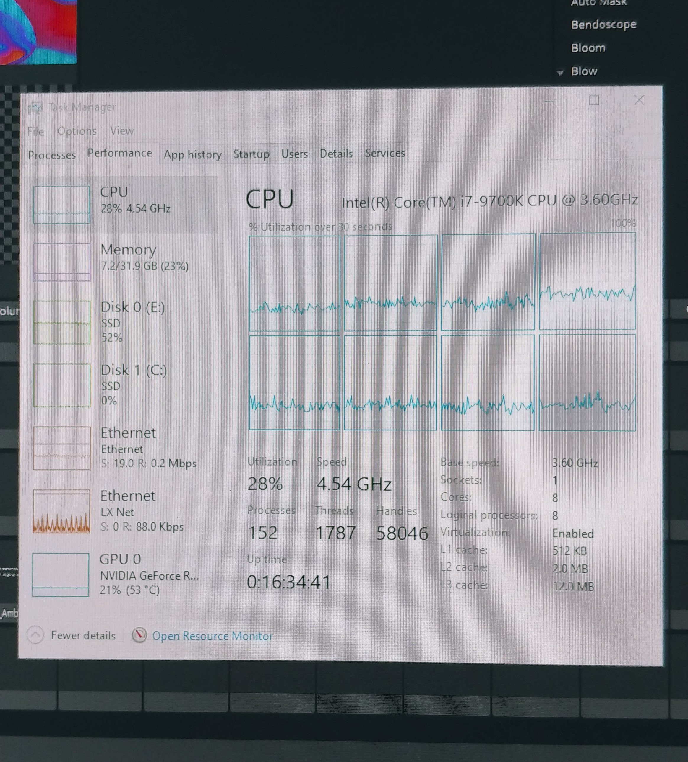 MV off: CPU cores under 30%, Disk 37% (m.2 ssd), Ethernet S:26Mbps R: 100kbps, GPU 44%