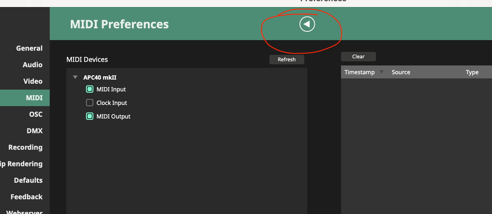Midi Input and Midi output activated. Mapping mode is absolute.