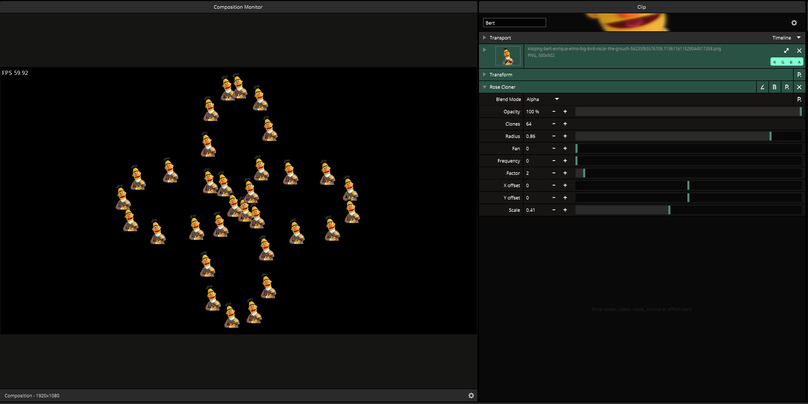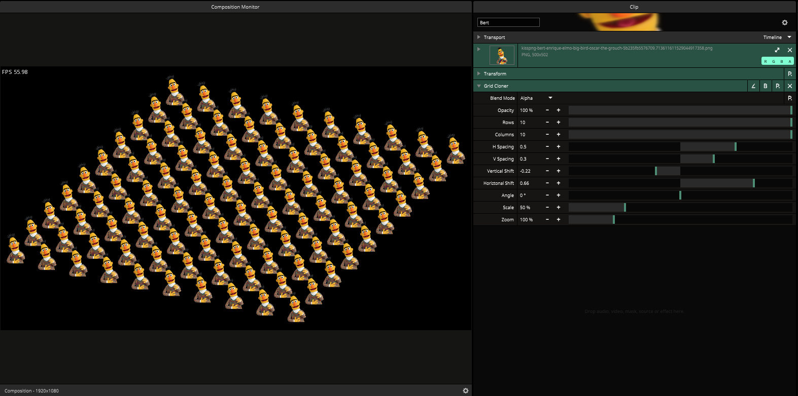 Am slowly getting into the cloners - they are very cool and i LOVE the Delay function - what would be amazing (as a Cinema4D user) would be if there was some type of 'Grid' Cloner, or even a Linear Cloner in X or Y directions - and also to be able to position the Center in X and Y directions would be fantastic.