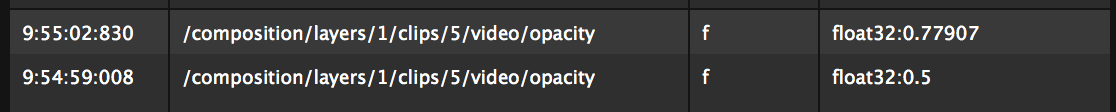 So for 50% intensity, it should the string should look like this: /composition/layers/1/clips/4/video/opacity 0.5