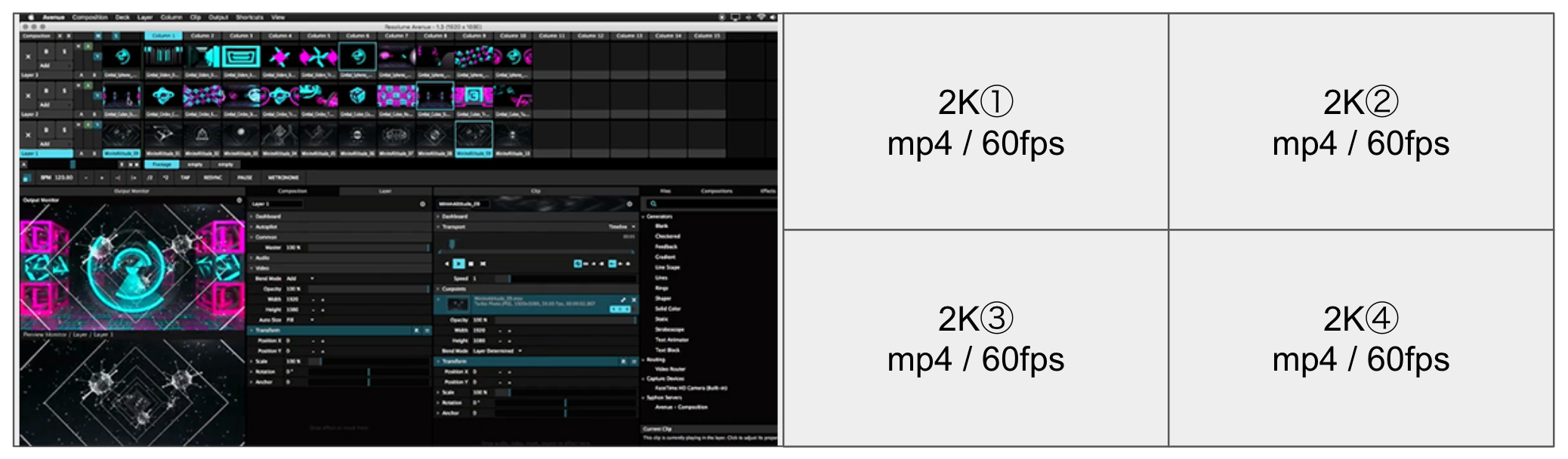 Video files: 4 simultaneous 2k 60fps video files.