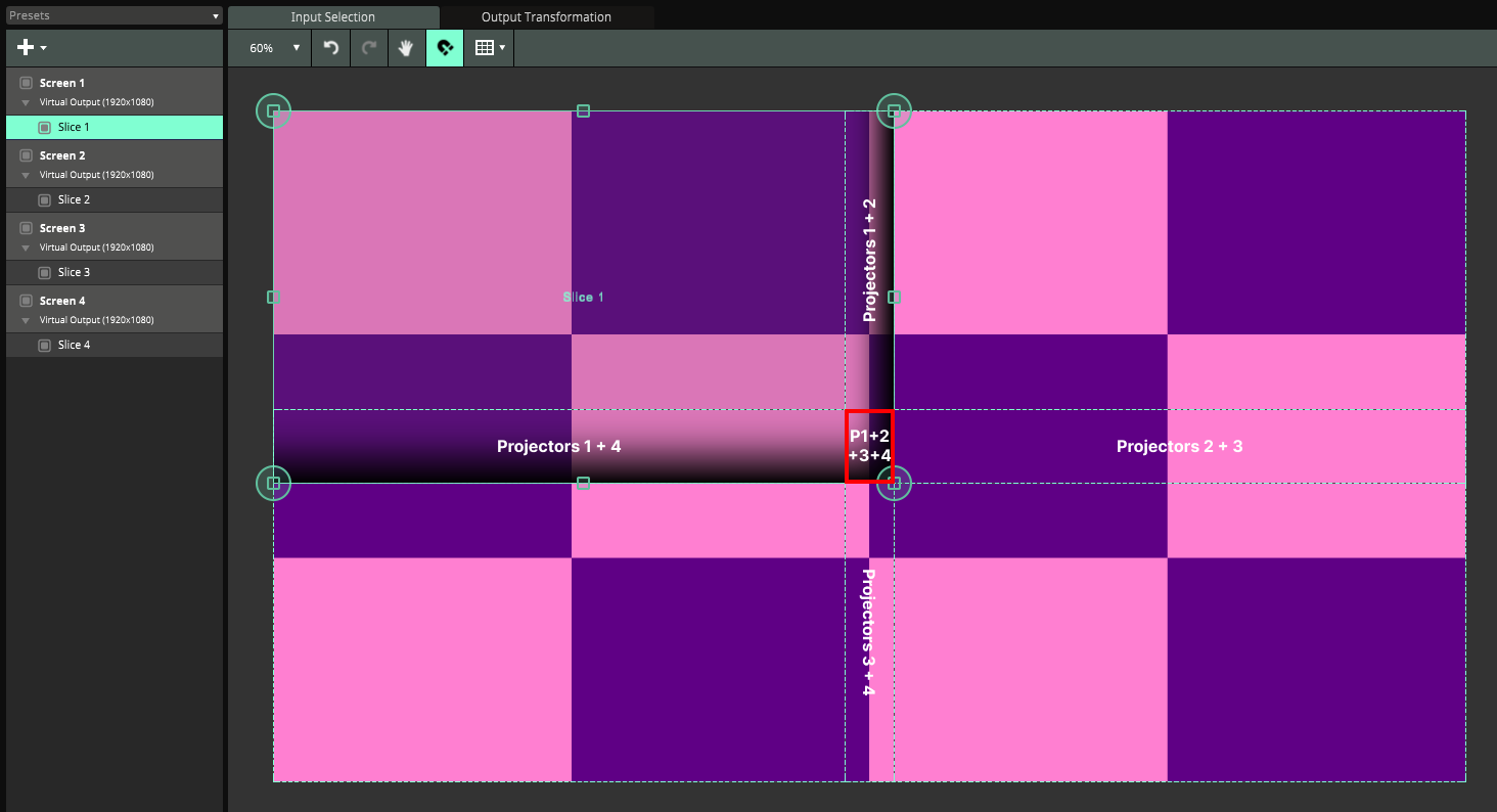 More specifically, I'm wondering about the brightness of the zone I've circled in red, where all 4 projections overlap. I understand that Resolume calculates the soft edge automatically based on the overlap but does it take into account the fact that there are four slices in this spot?
