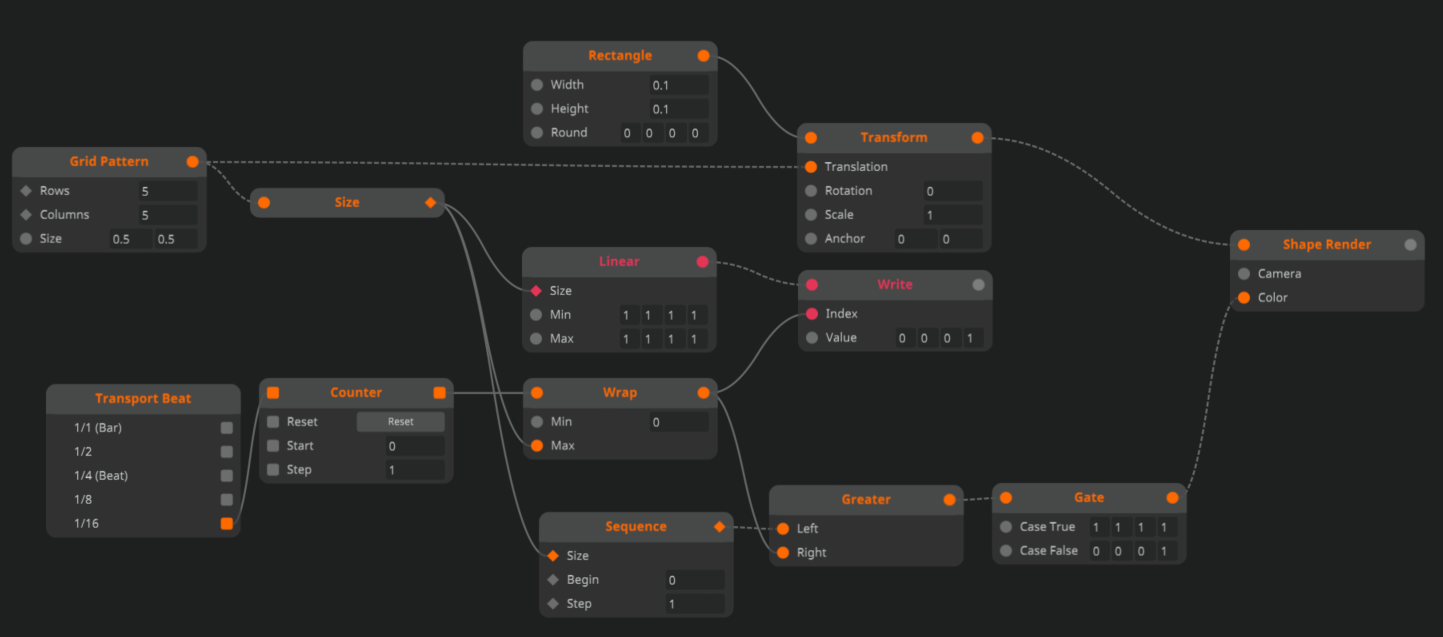 Hi, I have a grid of squares in which I am changing the color of one of the squares in sequence on the beat i.e. square 1 then square 2, etc, and then back to one. This probably isn't the best way to do it but it works.