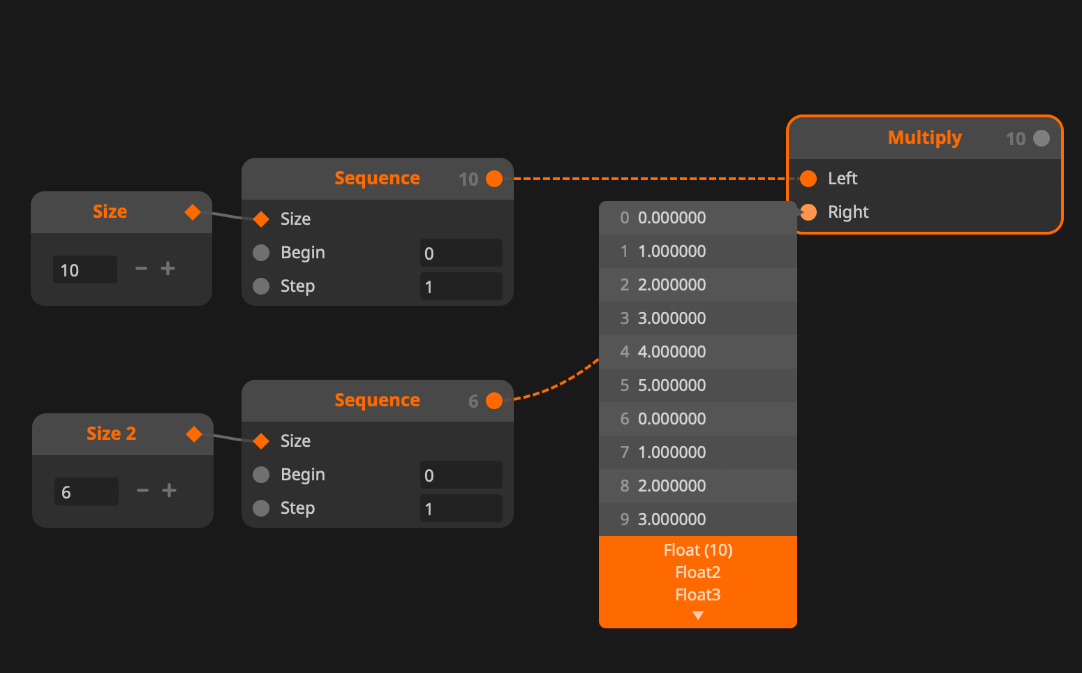 Here we clear the buffer first, in case we have a previously failed attempt. Then we send all values, one by one, in order, until we filled the buffer up. And then send it out when we are certain we are done processing. The upside of this is that the buffer node has a exposed size inlet, the downside is that it requires a lot more back and forth between Wire and the control panel.
