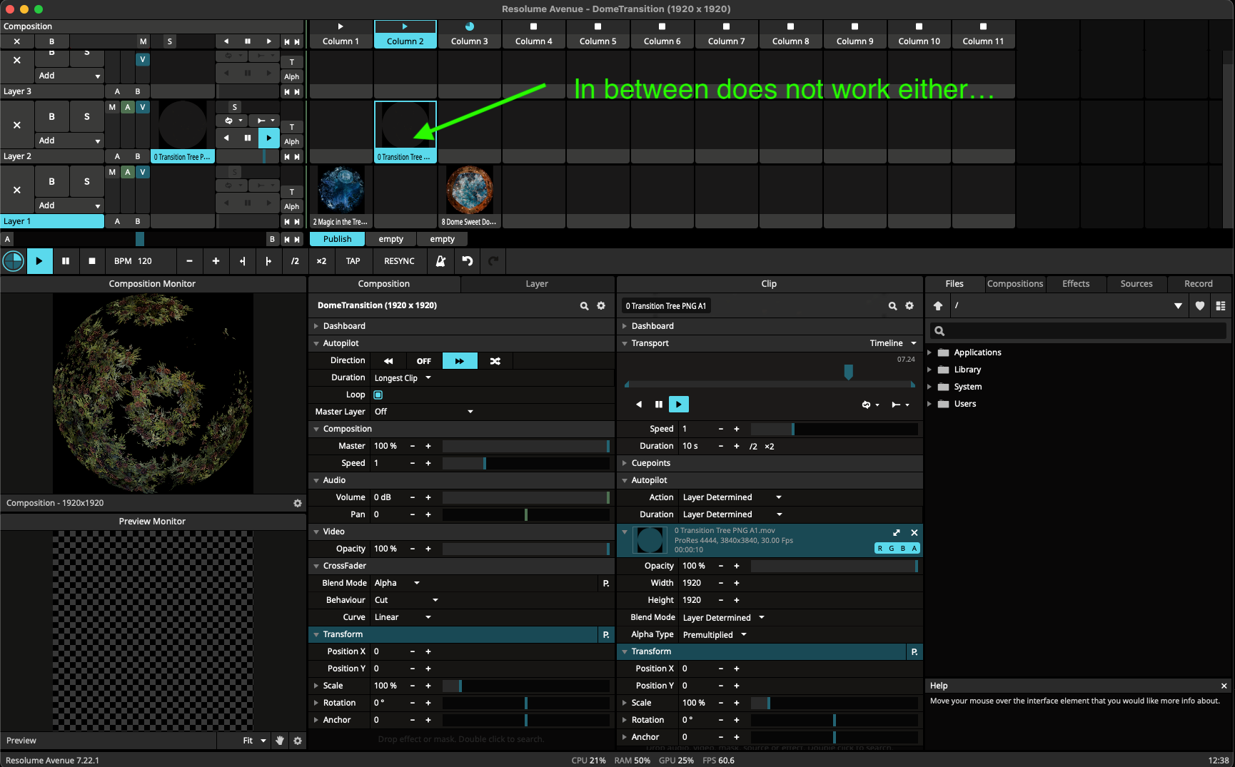 But over in Resolume I have to place the transition clip in one of the two columns. Or in between. See screenshots.