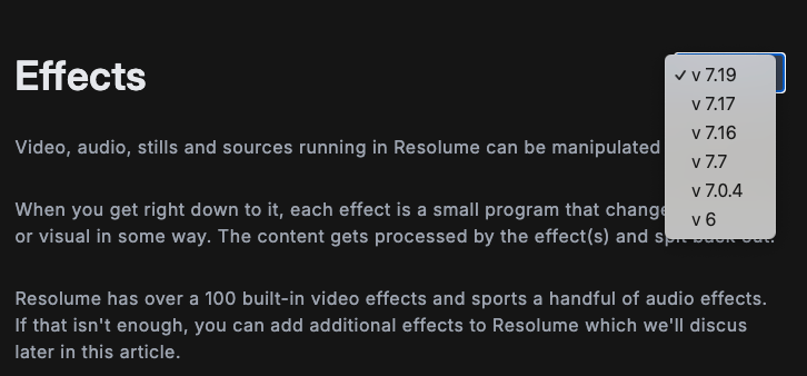 tutorials don't help. Reason i bring this up is someone asked on the resolume group on FB about copying effects. They were using 7.13.2. To find out if that version supports that very specific feature you have to figure out when that feature was added. It’s quite annoying especially when trying to figure out what features were added when. With a manual for each version where you can add new features and make them easily searchable.