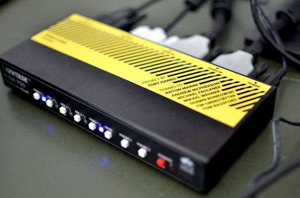 Put simply, it allows you to connect two DVI sources, fade between them with a crossfader, and send the resulting mix as one fresh, crispy DVI signal. In the words of Toby himself: "Boom…"
