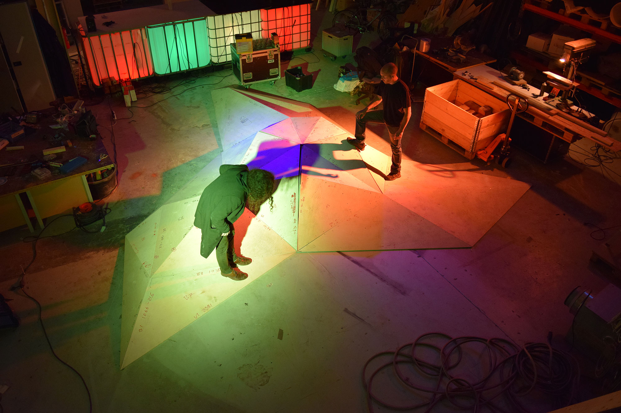 I will project a mesh onto the sculpture and when ever a person steps on one of the polygons of the floor I want the mesh to warp or deform like rings on the water.
