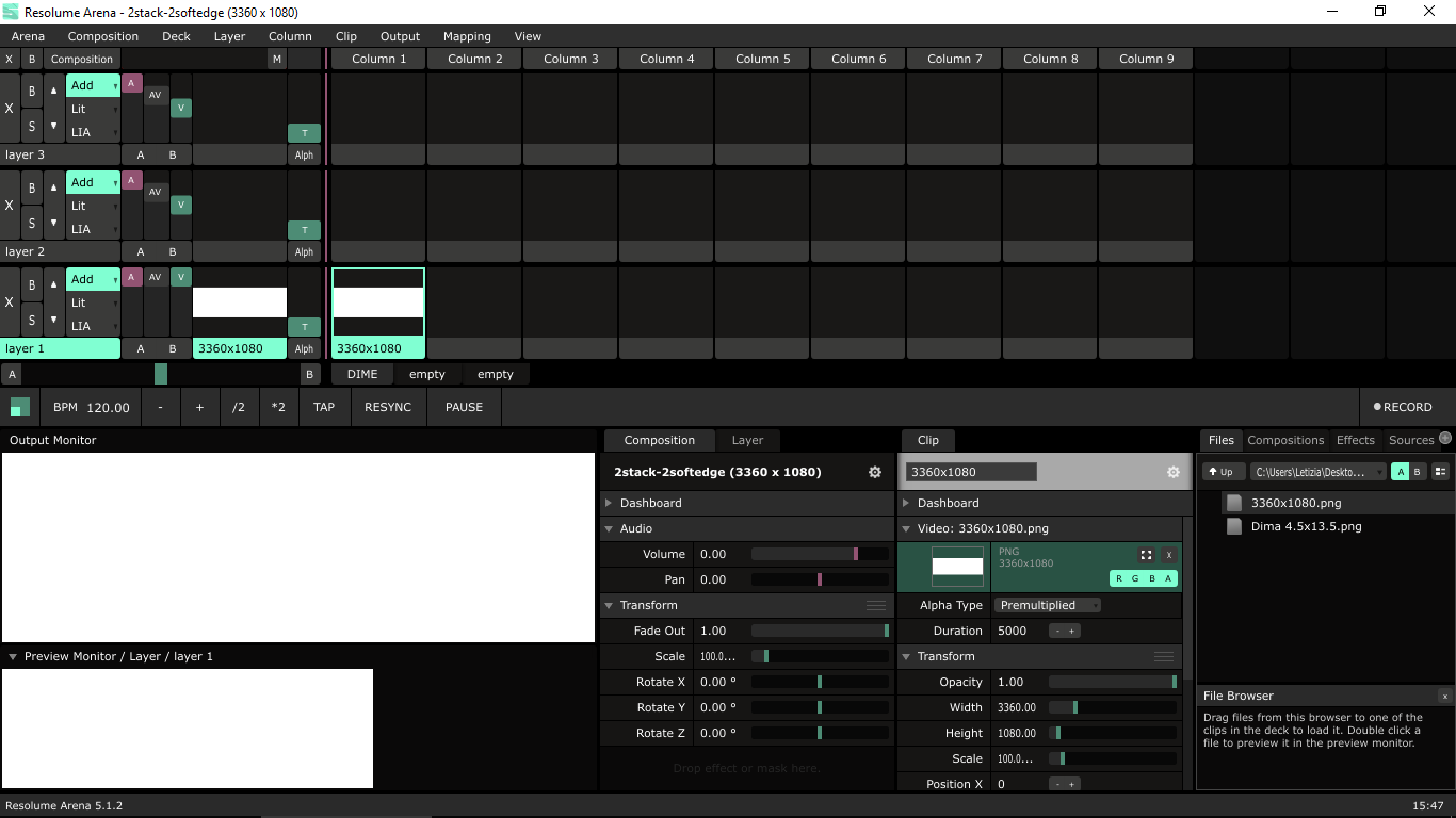 Projectors are set up so 2 are assigned the "left slice" and the other 2 the "right slice". The overlapping area is of 25% of projector rasters. The size of the composition is of 3360x1080 px.