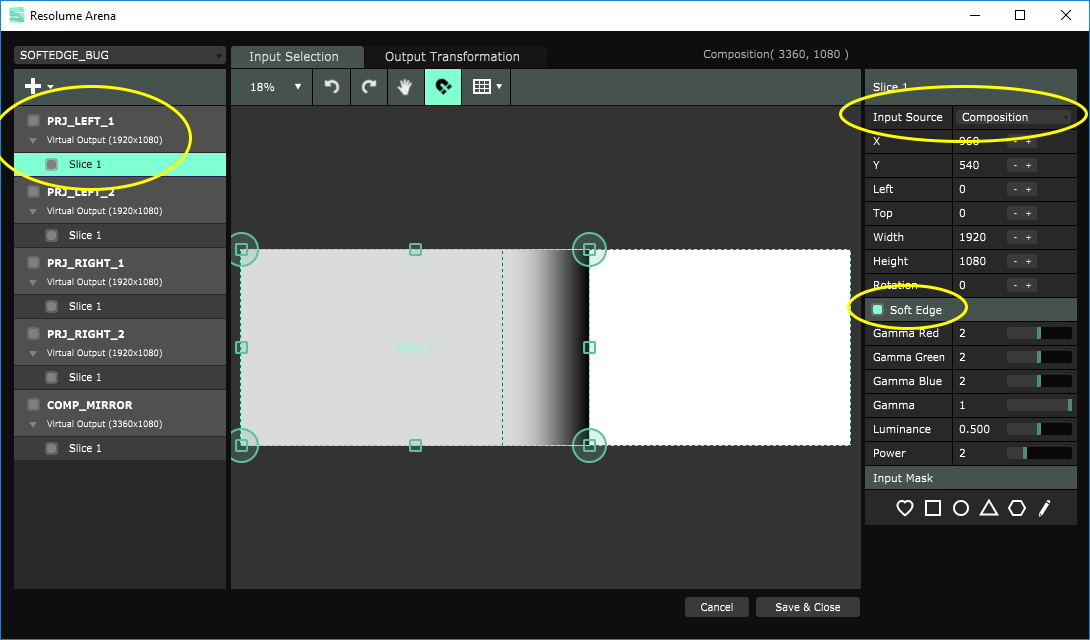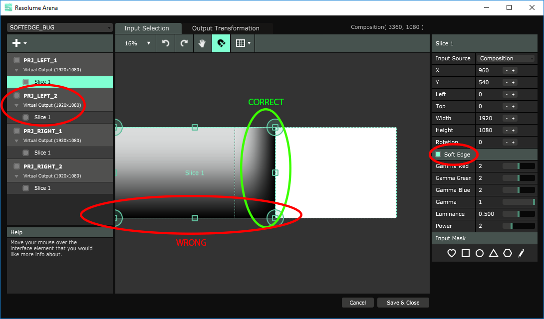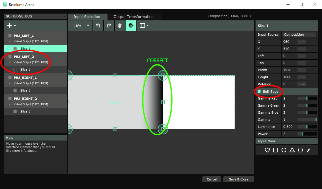 - set up the first projector of the "left stack", with only one slice and "composition" as input source. Don't forget to turn on "Soft Edge" checkbox