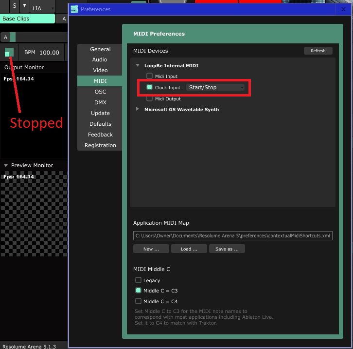 I have had Midi clock in set in Resolume for a long time. Seems as in Resolume 5.1.3, if the Midi clock in is set but my external program Virtual DJ is not playing so there is no midi clock signal, my BPM clips won't play.